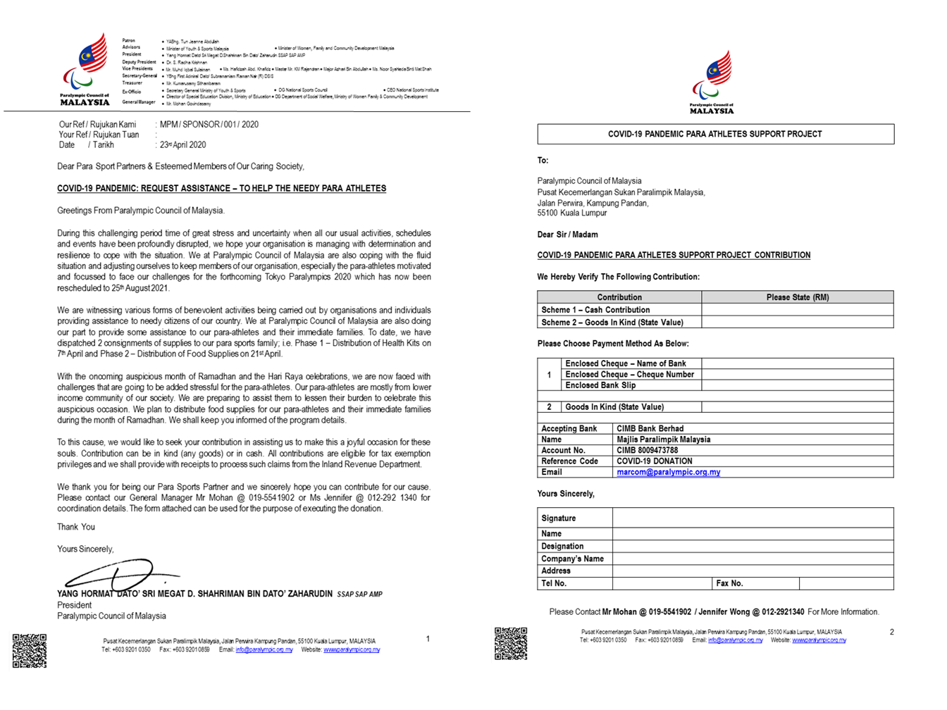 The Paralympic Council of Malaysia (PCM) has taken initiatives to assist the needy para-athletes during this difficult time. PCM has delivered Healthcare Kits on 7 April (Phase 1) and Food Supplies on 21 April (Phase 2) by e-hailing services. For our Phase 3, we are seeking donors to help out our para-sports community especially during this auspicious month of Ramadhan and eventual Aidilfitri celebrations.
