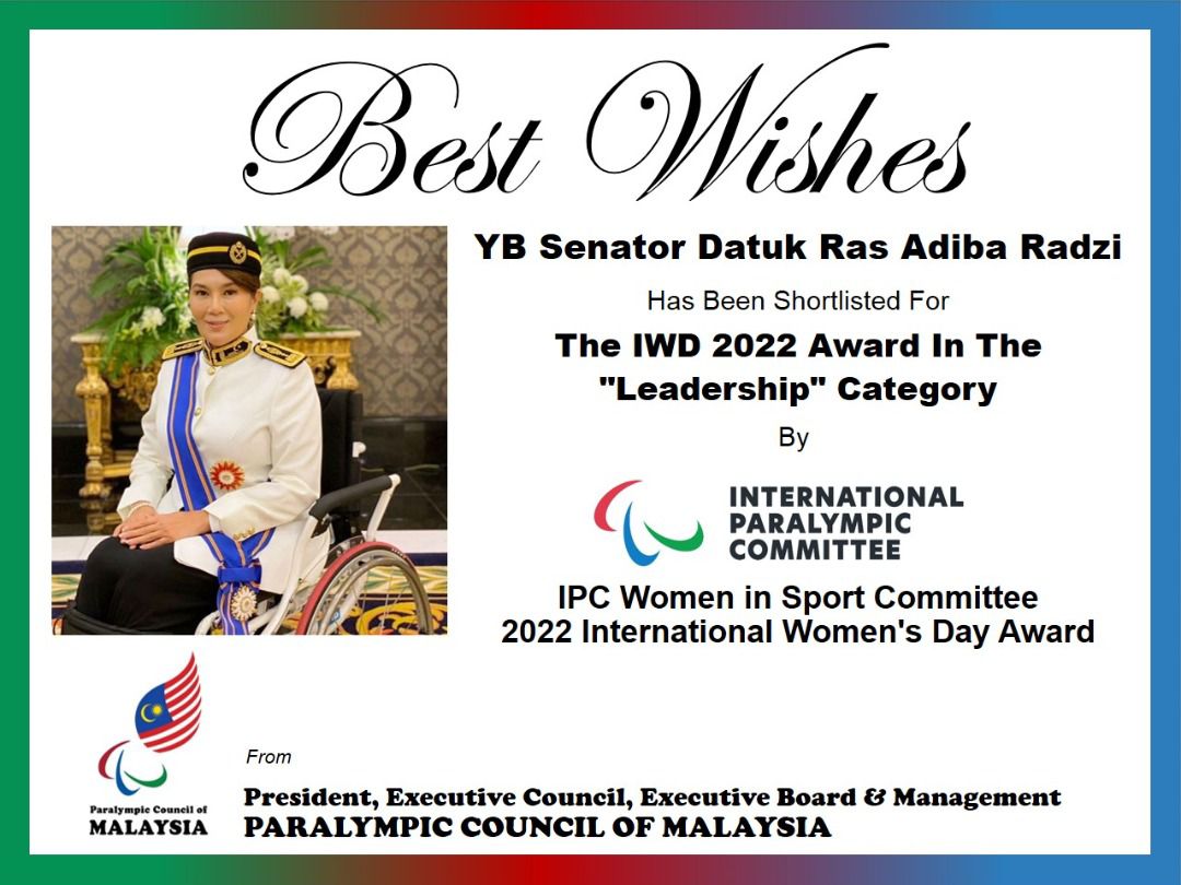 Para Shooting Association Malaysia president Senator Datuk Ras Adiba Radzi has been shortlisted for the 2022 International Women’s Day awards by the International Paralympic Committee (IPC)
