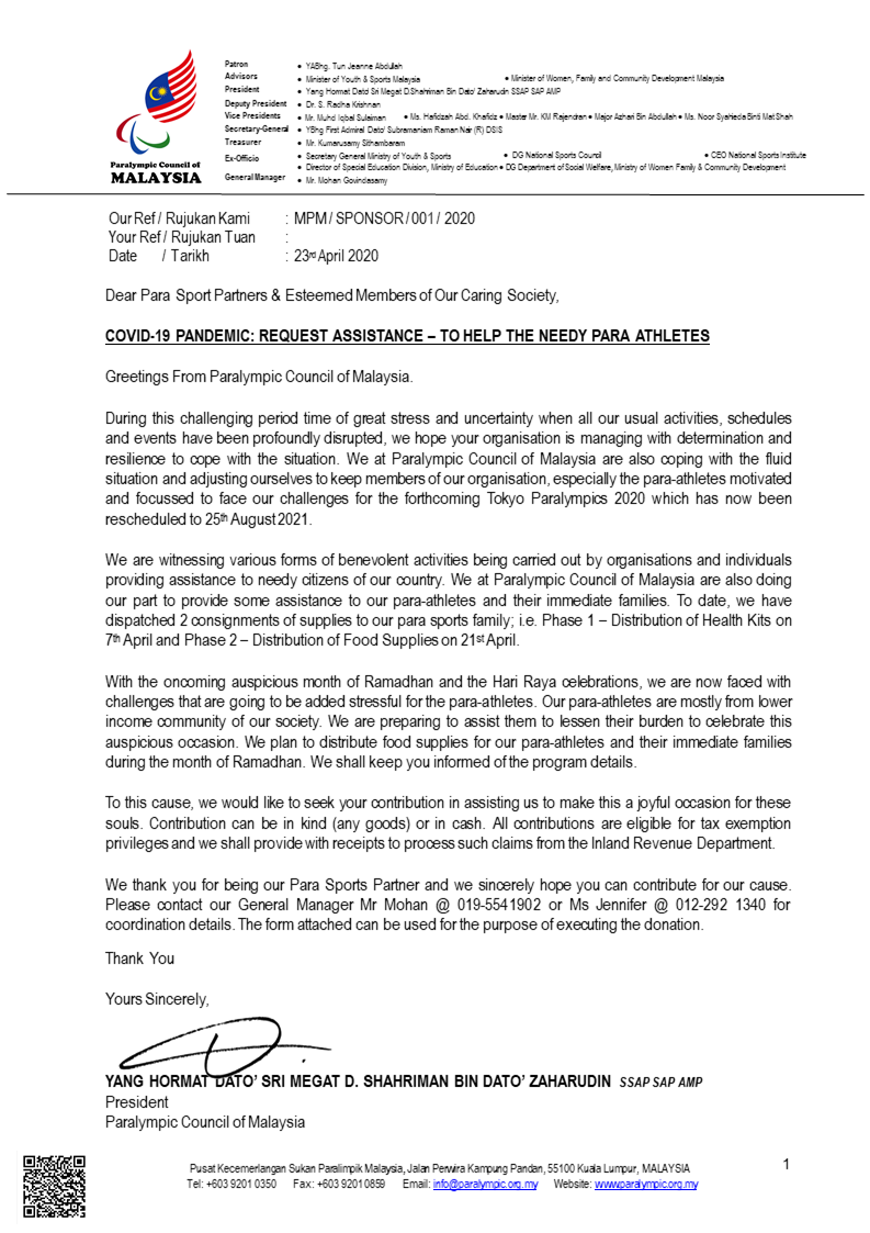 The Paralympic Council of Malaysia (PCM) has taken initiatives to assist the needy para-athletes during this difficult time. PCM has delivered Healthcare Kits on 7 April (Phase 1) and Food Supplies on 21 April (Phase 2) by e-hailing services. For our Phase 3, we are seeking donors to help out our para-sports community especially during this auspicious month of Ramadhan and eventual Aidilfitri celebrations. Contribution can be in kind (any food supplies) or in cash.