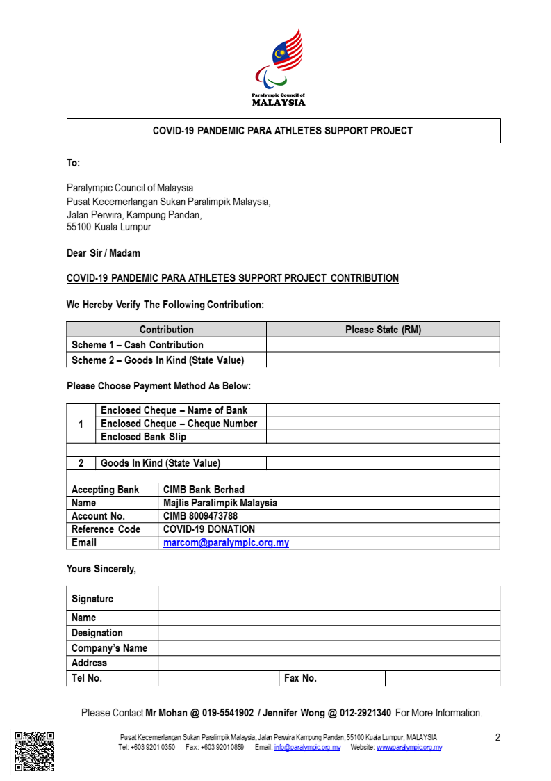 The Paralympic Council of Malaysia (PCM) has taken initiatives to assist the needy para-athletes during this difficult time. PCM has delivered Healthcare Kits on 7 April (Phase 1) and Food Supplies on 21 April (Phase 2) by e-hailing services. For our Phase 3, we are seeking donors to help out our para-sports community especially during this auspicious month of Ramadhan and eventual Aidilfitri celebrations. Contribution can be in kind (any food supplies) or in cash.